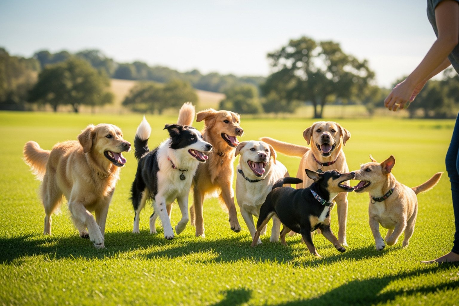 • Secure Fencing: For facilities with outdoor play areas, secure and sturdy fencing is non-negotiable. Our five-acre ranch is designed with safety in mind, ensuring our wide-open spaces are secure for all our playing pups.